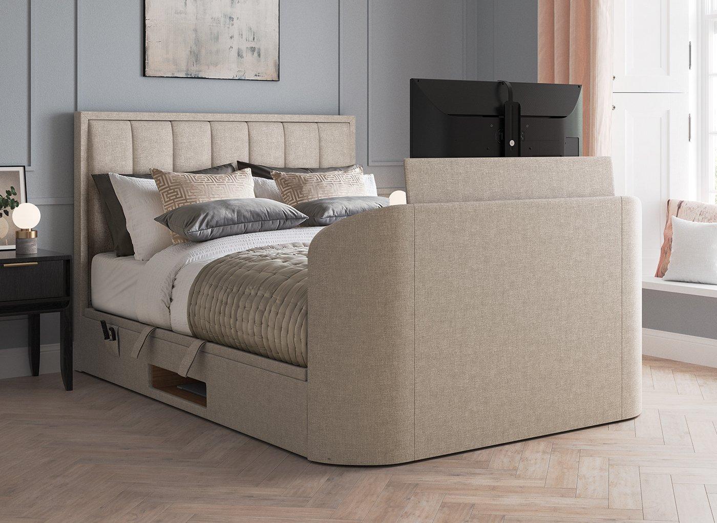 . Sapporo Ottoman TV Bed with Surround Sound. Sleepmotion 400i Adjustable Platform Bed Frame. Luxurious TV bed with contemporary grey fabric finish.